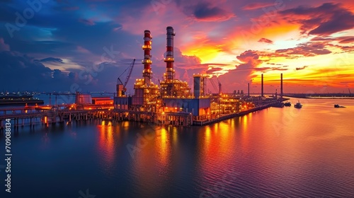 © ANEK, Fototapeta premium Gas turbine electrical power plant factory in dramatic twilight sunset.