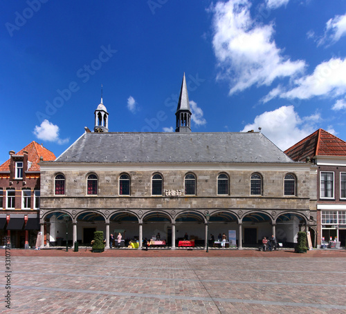© float, Fototapeta premium Gasthuiskerk church facade with its town hall like loggia at a market square in the old town of Zierikzee, Netherlands