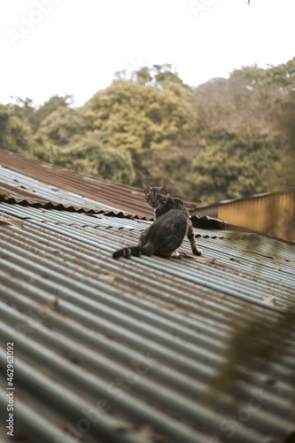 Obraz premium Gato en el tejado con naturaleza detrás.