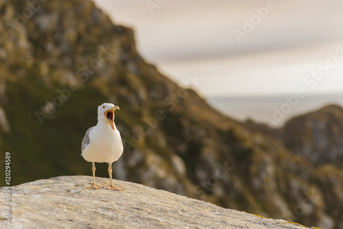 Naklejka premium Gaviota al atardecer en Islas Cies (Pontevedra, España).