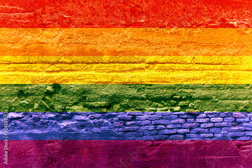 Fototapeta premium Gay flag painted on a brick wall, Rainbow background