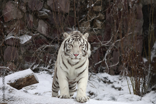 © andamanec, Fototapeta premium Gaze of a white bengal tiger, stepping over the fallen tree in snowy forest.