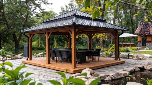 Naklejka premium Gazebos: Elegant, roofed, open-sided shelters crafted from wood or metal, offering a shaded area perfect for social events, gatherings, or quiet relaxation.