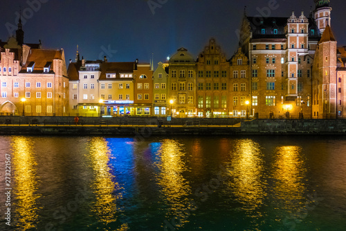 © kateafter, Fototapeta premium Gdańsk - 07 lutego 2019: Widok na Główne Miasto Gdańska od strony Motławy w nocy. Gdańsk, Polska