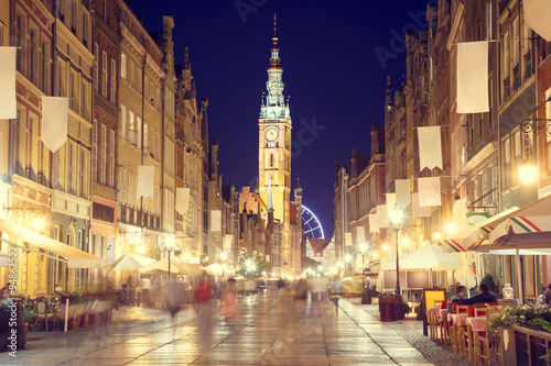 © Maryia Bahutskaya, Naklejka premium Gdansk Street with Town Hall at Night