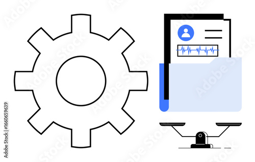 Fototapeta premium Gear for process, folder with analytics and user profile for data, and balance scale for evaluation. Ideal for productivity, workflow, analytics, assessment, decision-making, organization