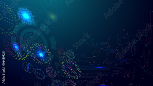 © Maksidul, Obraz premium Gear wheel technology pattern on blue gradient background. Hand drawn vector Abstract technology background. Cogwheels theme.Secure digital background. Virtual confidential, programming protection