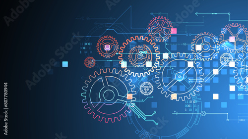 © Alex, Obraz premium Gear wheel technology pattern on gradient background. Hand drawn vector.