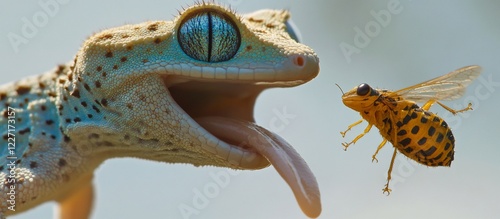 Obraz premium Gecko catching insect, blurred background, wildlife photography