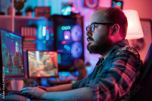 © Nomad_Soul, Obraz premium Geek at home with artificial light, tech-themed background. Generative AI