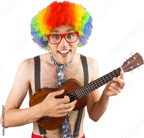 Obraz premium Geeky hipster in afro rainbow wig playing guitar
