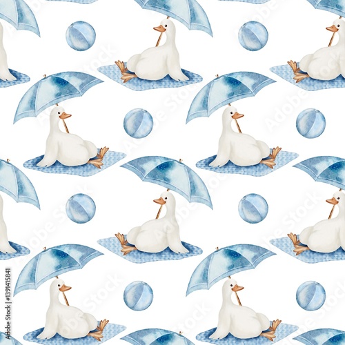 © Yuliia Kostenko, Obraz premium Geese enjoying a sunny day with umbrellas, balls, and a cheerful background pattern