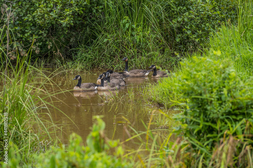 Fototapeta premium Geese family swimming together