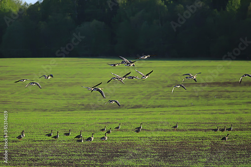 © kichigin19, Fototapeta premium geese spring migratory birds in the field, spring landscape background