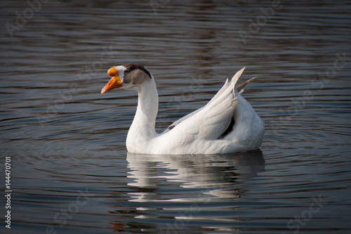 © Даяна Куценко, Naklejka premium geese swim in the lake one by one and in pairs. Grey, white like in a fairy tale. Early spring, the weather is warm, but not hot. A beautiful day in the village on the farm.