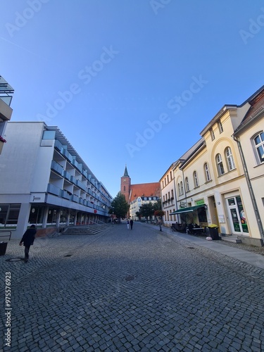 © Random_Mentalist, Naklejka premium Gehweg mit blauem Himmel und der Sankt - Marien - Kirche im Hintergrund - Stadtzentrum von Bernau bei Berlin, Brandenburg