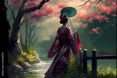 © Cala Serrano, Fototapeta premium Geisha taking a walk in the cherry blossom forest. Ai Generated