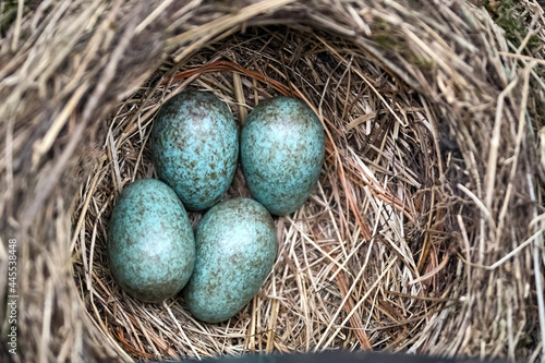 © Michael, Obraz premium Gelege einer Amsel ( Turdus merula ) oder Schwarzdrossel. 4 Eier im Nest.