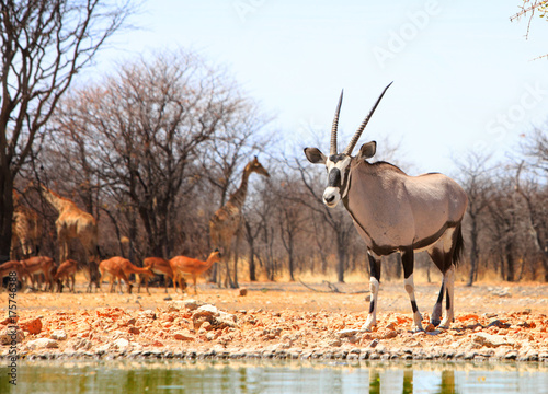 Fototapeta premium Gemsbok Oryx standing on the dry African Plains with giraffe and impala in...