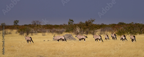 © S.Periquet-Pearce, Fototapeta premium Gemsboks leaving a waterhole in the dry grass