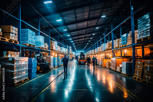 Fototapeta premium General view of a warehouse aisle with workers.