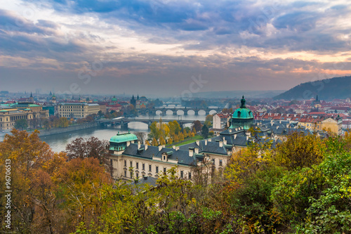 Naklejka premium General view of bridges in Prague in autumn. Yellow trees flavor the...