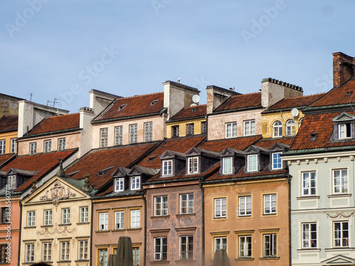 Fototapeta premium General view of the unified facades of historic townhouses with varying pastel colors and red tiled roofs in Warsaw Old Town, Poland.