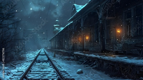 © QasimVisuals , Naklejka premium Generate snowy train station scenes with dark skies using AI.