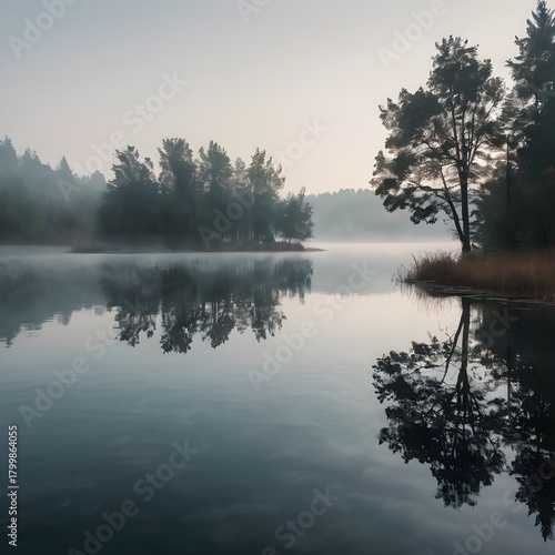 Fototapeta premium Generated AI, Calm lake with mirror reflection, foggy morning, soft cinematic light, minimalist landscape