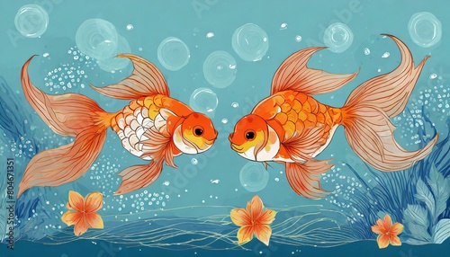Naklejka premium 清涼感のある青い背景、それは心地よい夏の風物詩、透明感のある綺麗な小さい金魚が二匹、快適な環境で生活、シンプルなイラスト風に仕上げる generated by AI