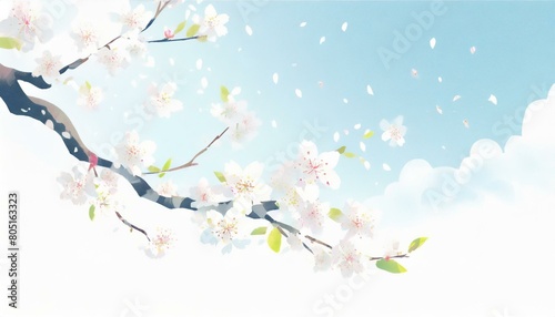 Fototapeta premium 清涼感、明るめの白い背景、くっきり、青空、舞う、美しい桜を描くイラスト generated by AI