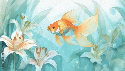 Naklejka premium 綺麗な金魚が百合と共に夏の香りを届ける透き通るような水墨画風のイラスト、水色の壁紙とグラデーション generated by AI