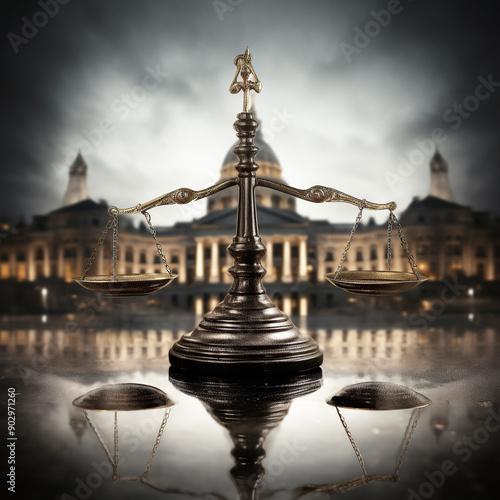 © seanzheng, Fototapeta premium generated Illustration of law scales sculpture in front of courthouse.