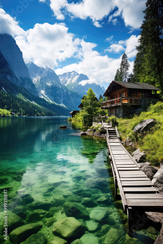 Fototapeta premium generated illustration of mountain ,forest with rocks and cabin by the lake.