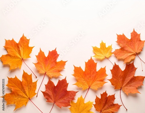 Obraz premium Generated image 赤や黄色に色づいたメープルリーフ 落ち葉 フラットレイ 暖かい光 秋 背景素材