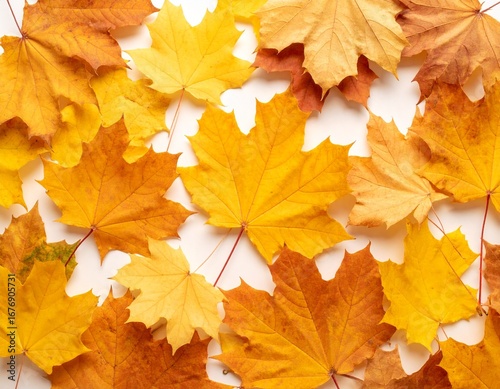 Obraz premium Generated image 赤や黄色に色づいたメープルリーフ 落ち葉 フラットレイ 暖かい光 秋 背景素材
