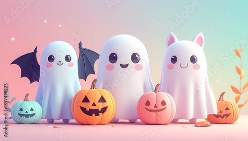 Obraz premium Generated image かわいいおばけとコウモリとかぼちゃのイラスト 楽しいハロウィン