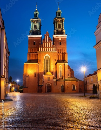 © SandraSevJarocka, Naklejka premium Generated image A view of the illuminated Cathedral Basilica of St. Peter and St. Paul in Poznan at night