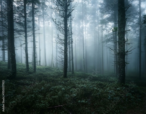 © SandraSevJarocka, Obraz premium Generated image dark foggy forest panorama view