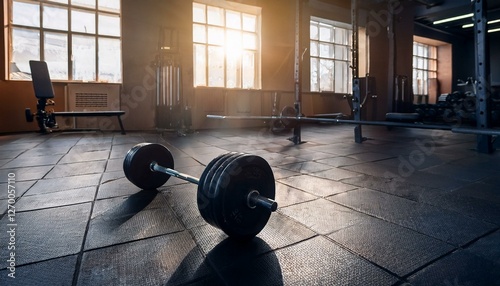 © SandraSevJarocka, Naklejka premium Generated image siłownia, sala sportowa i ciężary, leżąca sztanga z ciężarami na podłodze hali sportowej