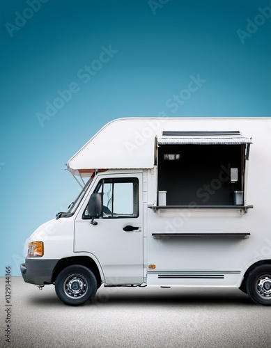 © SandraSevJarocka, Naklejka premium Generated image White food truck mockup side view on isolated background