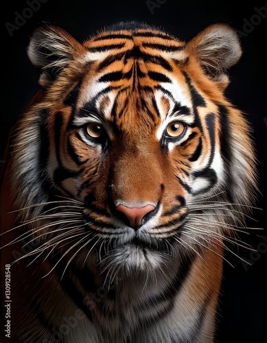 © tino, Fototapeta premium Generated imageStriking close-up portrait of a tiger with a direct gaze, set against a dark background, highlighting its majestic features.