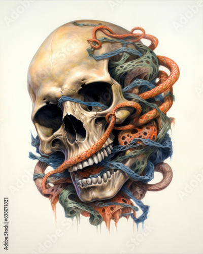 Fototapeta premium Generated photorealistic image of a gloomy skull with snakes on a white...