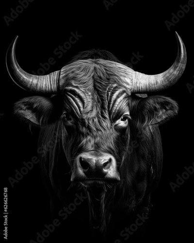 Naklejka premium Generated photorealistic portrait of a bull with long horns in black and white