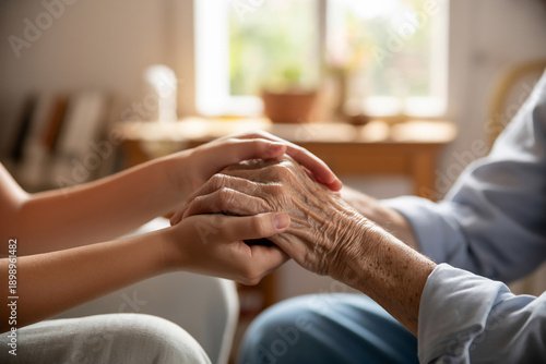 Naklejka premium 高齢者の手を優しく包む若者の手 Generative AI