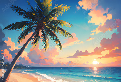 © Rummy & Rummy, Fototapeta premium 夕暮れのヤシの木がある海の風景 南国 generative ai