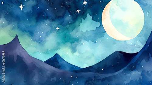 © AYANO, Obraz premium 月と夜空のファンタジックが水彩背景 Generative AI