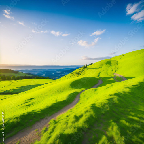Obraz premium 青空と緑の大地と道 Generative AI