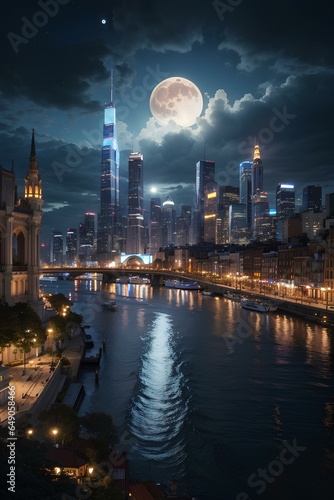 Fototapeta premium 100万個の光と輝く月が照らす、雄大な街並み Generative AI