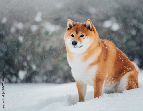 Obraz premium 雪の中で遊ぶ柴犬 Generative AI